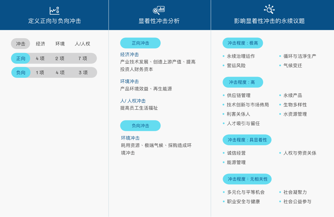 依循全球永续趋势与GRI 准则检视议题之合适性,透过问卷了解利害关系人对公司在环境、社会( 含人权)、公司治理三方面的关注面向,同时建立双重重大性评估方法,透过熊猫体育主管与价值链的关键伙伴评估ESG 议题对公司所产生的营运冲击程度,并在ESG 外部永续发展冲击方面,根据GRI 通用准则2021(GRI Universal Standards 2021) 的GRI 3:重大主题(Material Topics 2021),整合价值平衡联盟(Value Balancing Alliance, VBA)、哈佛商学院「影响力加权会计(Impact-Weighted Accounts)」研究计画等机构发展之经济、环境及社会层面冲击评估方法学,建构以冲击为基础的重大性分析流程,辨识重大性主题。
